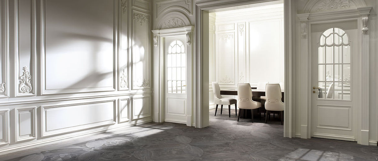 Drawing on the harmony and purity of neoclassical design, the Canova boiserie is conceived as an homage to Antonio Canova. Fully customisable, it shapes interiors of light and refinement, where sculpted relief details enrich the surfaces and impart a sense of solemn beauty and enduring character.