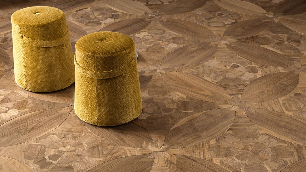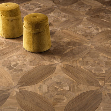 In some cases – Frammenti, Tricot and Ombre – they are actual mosaic compositions with an abstract style, in which wood plays the sole starring role, while in others, inspiration comes from delightful natural shapes, such as the soft design of Petali or the abstract floral patterns of Azalea, in which the wood can also engage with marble and metal inserts.